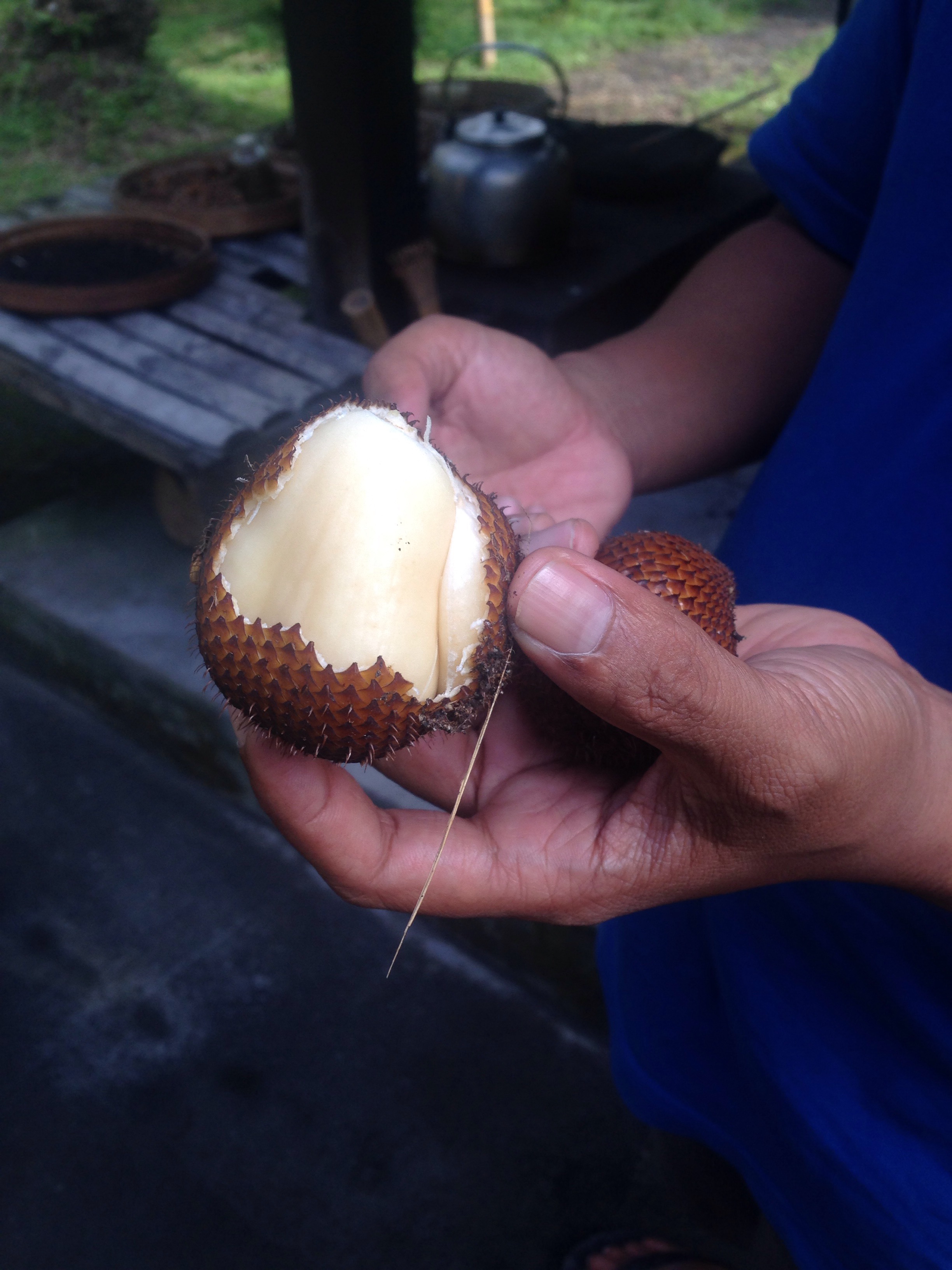 This is a snake fruit. My new favourite fry it’s. It has a spiked peelable skin, with the consistency of a lychee and the taste of an unripened strawberry. It’s delicious!